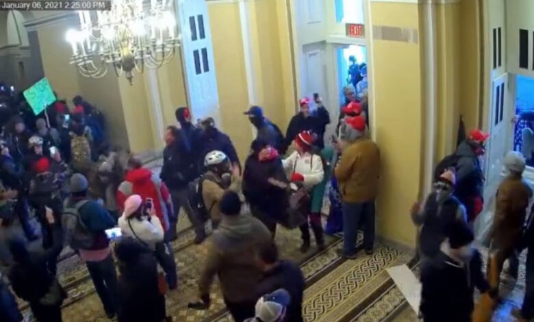 The clips cover a period of about 15 minutes on Jan. 6 — between 2:25 p.m. and 2:40 p.m. — in different locations inside the Capitol. They show rioters streaming through open doors and broken windows at an entrance on the Senate side; crowds of people walking into the Crypt, standing in a large crowd, and eventually dispersing; and, finally, rioters exiting as US Capitol Police officers in riot gear gather at the Senate entrance point to stand guard as a mob that’s outside looks in through the broken windows. There is no audio. The cameras are stationed up high and at a distance, providing a wide, stable perspective on the scene.