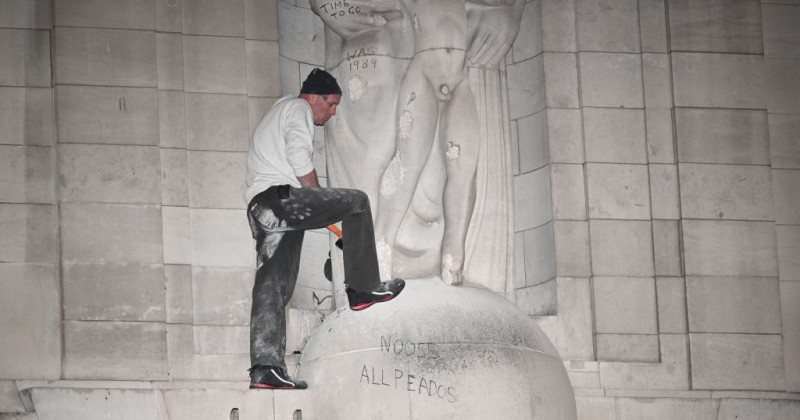 A protester carrying a hammer used an ordinary ladder to reach the monument, which was erected in 1933 by artist Eric Gill, who in 1989 was revealed to have sexually abused his daughters, sister and family dog.