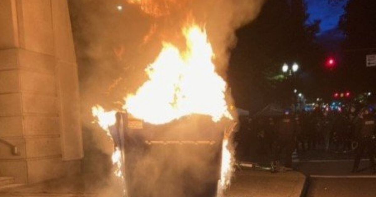 Dumpster Fire at the Justice Center near SW 3rd and Main set by people in the crowd. pic.twitter.com/pjRmMS3LkU