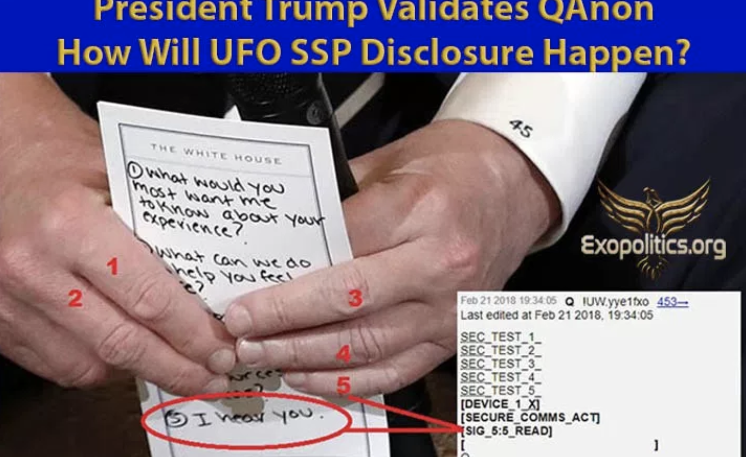 Only a few hours after the meeting, at 7:34 pm, EST, QAnon released a coded post referring to five security tests.