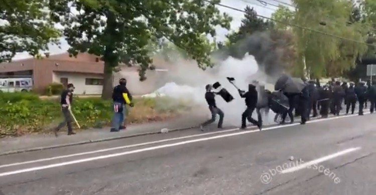 Smoke bombs and fireworks were launched as 50 Antifa goons in black bloc arrived.