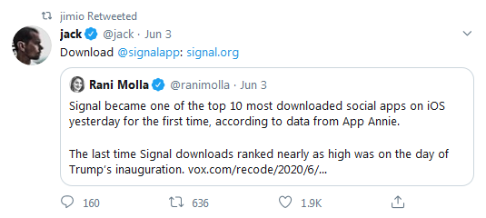 “Signal became one of the top 10 most downloaded social apps on iOS yesterday for the first time, according to data from App Annie. The app often sees spikes in downloads during tumultuous political times, but the last time Signal downloads ranked nearly as high was on the day of President Trump’s inauguration”
