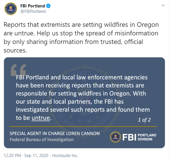 Reports that extremists are setting wildfires in Oregon are untrue. Help us stop the spread of misinformation by only sharing information from trusted, official sources. pic.twitter.com/ENc4c3kjep