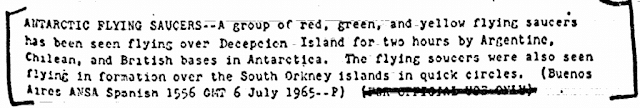 “ANTARCTIC FLYING SAUCERS” – A group of red, green, and yellow flying saucers has been seen flying over Deception Island for two hours by Argentine, Chilean and British bases (military) in Antarctica. The flying saucers were also seen flying in formation over the South Orkney islands in quick circles.”