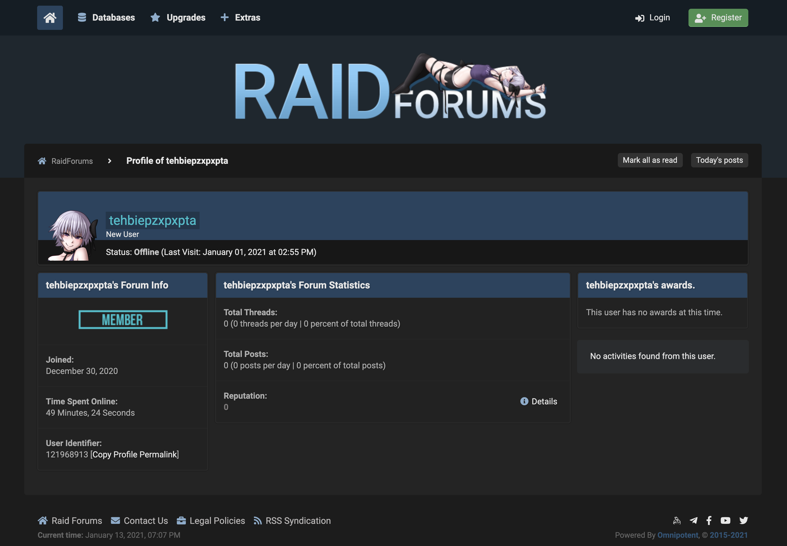 The image appears to be a screencap from Raid Forums, profile seen here https://raidforums.com/User-tehbiepzxpxpta.
