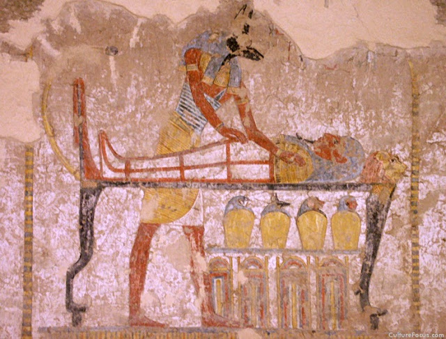 | The Egyptian God Anubus preparing a mummy for the afterlife. |