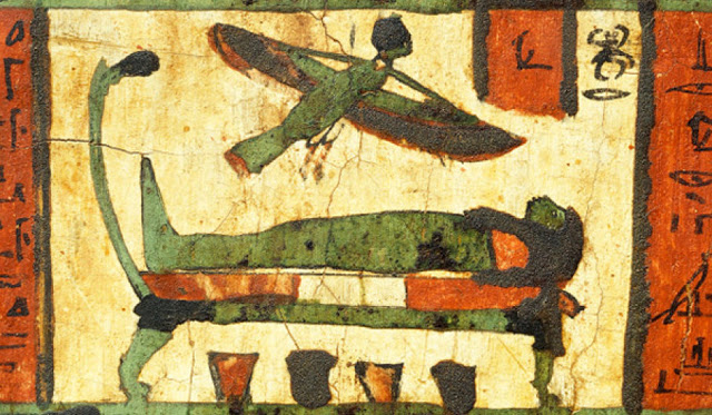 | The soul leaving the body upon death as depicted in ancient Egyptian pictographs. |