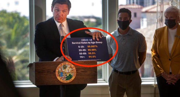 (Arjun Walia) Florida Governor Ron DeSantis recently lifted all restrictions on restaurants and other business in Florida and banned local fines against people who refuse to wear masks. He did so after showing new statistics just released by the Centers for Disease Control (CDC) showing very high survival rates, as you can see from the picture picture above. The CDC has a page on their website titled “Covid-19 Pandemic Planning Scenarios.” According to them, “Each scenario is based on a set of numerical values for biological and epidemiological characteristics of COVID-19 illness, which is caused by the SARS-CoV-2 virus. These values—called parameter values—can be used in models to estimate the possible effects of COVID-19 in U.S. states and localities. That’s where the numbers come from.