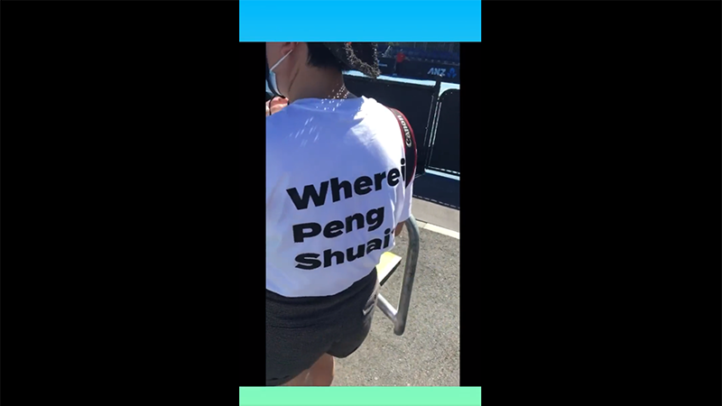 The shirts and banner read “Where is Peng Shuai?”, referring to the previous disappearance of the Chinese tennis star who accused a high ranking CCP official of sexually assaulting her.