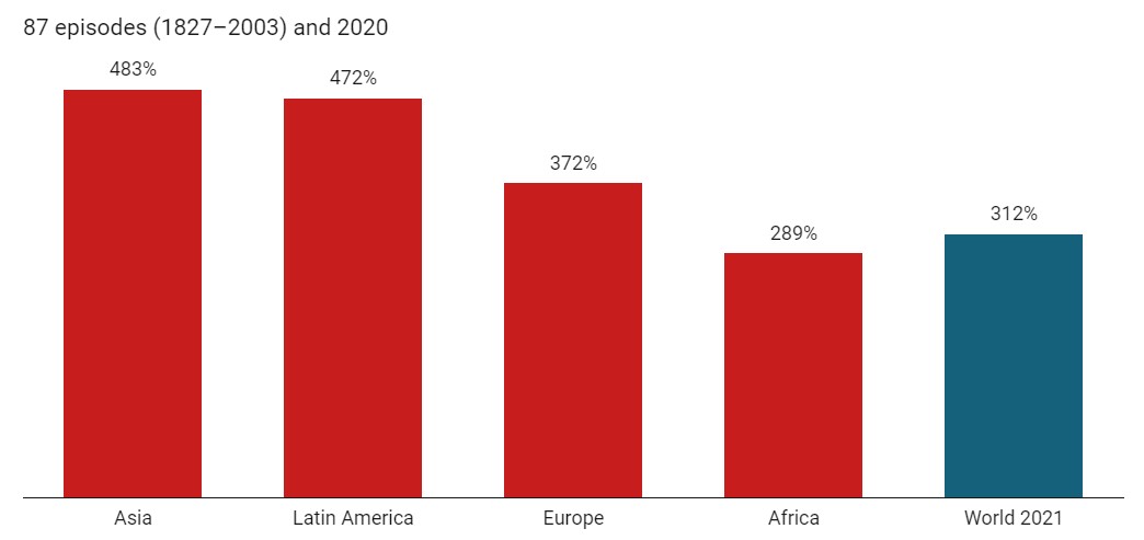 Chart 4 analyzes eighty-seven historical episodes of bankruptcy (over 175 years).5 The chart shows that African countries have gone bankrupt once their debt was greater than 2.89 times their tax revenue. Asian countries have gone bankrupt once their debt exceeded 4.83 times their tax revenue.6 At the beginning of 2021, global debt was around 3.12 times global public revenue (3.3 times in developed countries and 2.9 times in developing countries). Accordingly, it appears we are very near the maximum acceptable debt level. If the public sector continues to spend more than it earns, debt nonpayment will become a theme in the coming years.