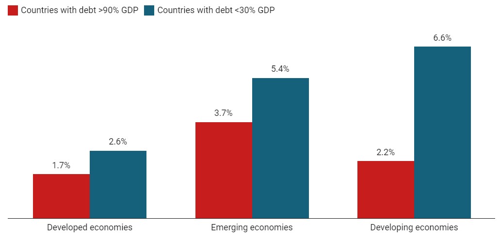 The countries with the greatest amount of public debt saw per capita income grow the least, as seen in chart 1.