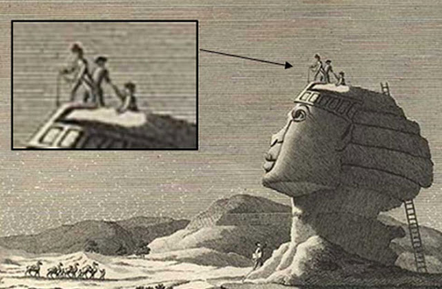 Around 1798, Vivant Denon etched an image of the sphinx, although he hadn’t copied it that well. However, he no doubt knew that there was a hole on the top of its head as he had drawn an image of a man being pulled out.