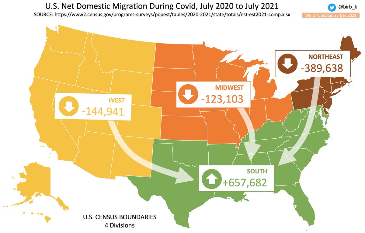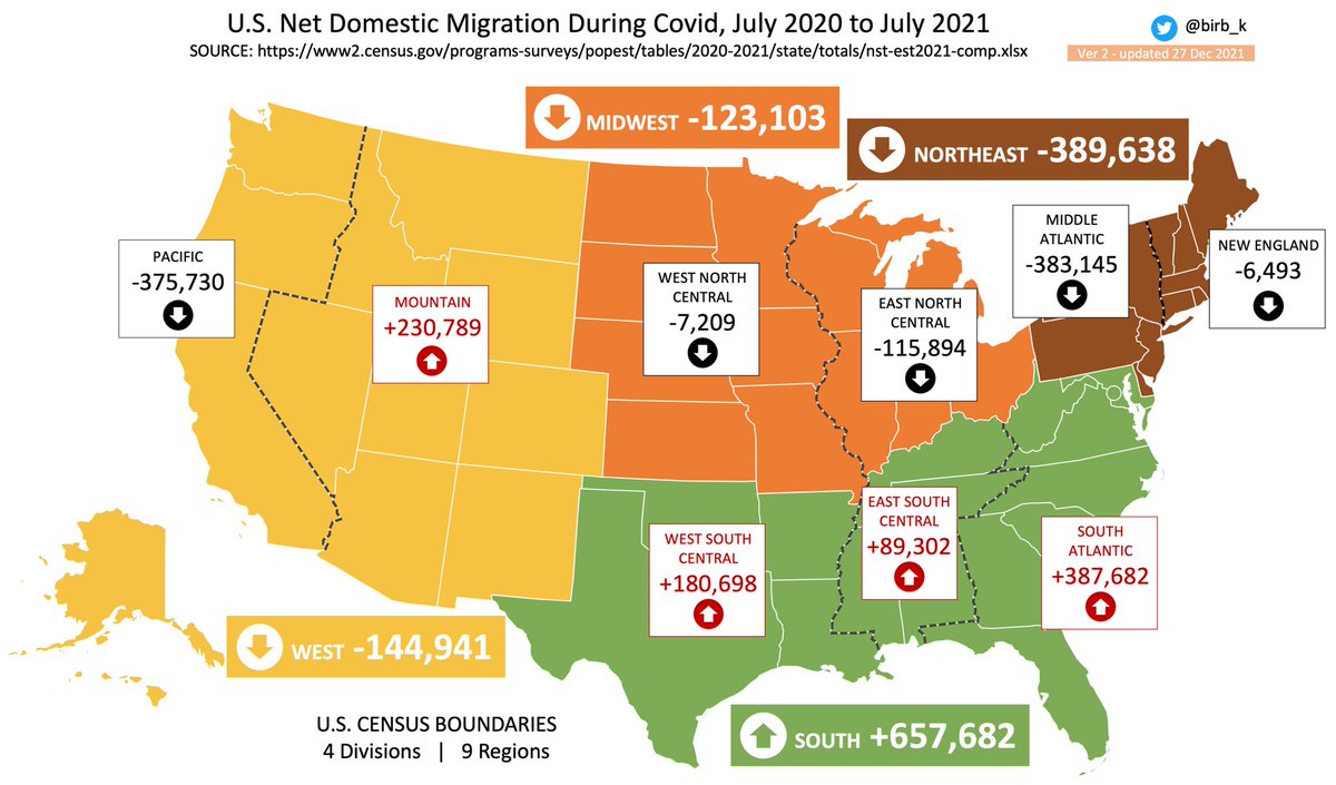 Chart 2/10. Net Domestic Migration Jul 2020 to Jul 2021, by the nine U.S. Census “Regions.” The three South Regions plus the Mountain Region are up, all others are down. Adding all nine numbers together equals zero, or a true “Net” migration, per Census design/analysis.