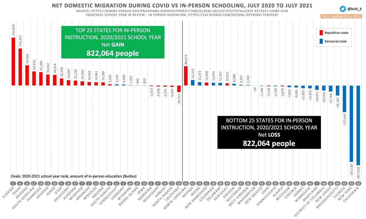 Chart 8/10. Public policy around child education appears to be a big influencer. Looking at the 25 states with most in-person education during 2020/2021 school year, vs the 25 states with lowest in-person education, reveals a net movement of over 800K people during Covid.