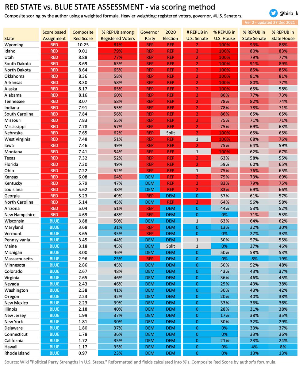 Chart 10/10. Identification of Red vs. Blue states was done using this admittedly imperfect homemade scoring system that takes in governor, registered voters, 2020 vote, and legislative representation at both the Federal & State level. Where nearly a tie, governor breaks tie.