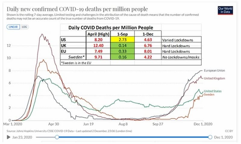 The second surge is now obvious. This data source uses a seven-day moving average of daily deaths per million people to make it easier to directly compare per capita death trends regardless of population differences. Sweden (a part of the E.U.) was included only because it alone shunned severe lockdowns and mask mandates in hopes that inaction would hasten the achievement of herd immunity and thereby help avoid a second surge. Unfortunately, Sweden’s hopes seem dashed.