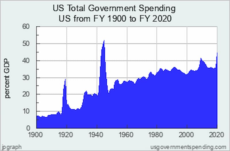 See, I think that the reality behind the poker game is this chart of U.S. government spending as a percent of GDP. It shows 80 years, from 1900 to 1980 of glorious ruling-class growth, with loot and plunder for all, punctuated by a couple of lovely wars. But since 1980, the total spending as a percent of GDP has been flat, at about 35-36 percent GDP.