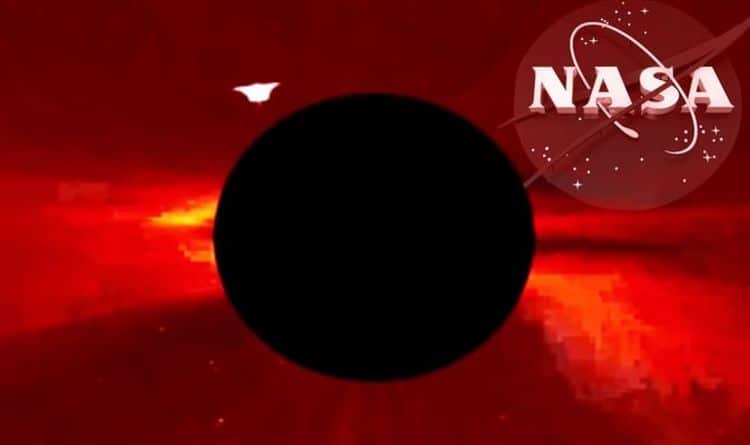 NASA’s Solar and Heliospheric Observatory (SOHO) project is an ambitious attempt to study the internal structure and outer atmosphere of the Sun. Since it began orbiting our star, NASA’s space telescope has made numerous achievements, from understanding the Sun’s complicated gas currents hidden beneath its surface, to tracking changes in its magnetic fields. But UFO hunter Scott Waring believes the NASA solar observatory has now made its most amazing discovery to date – capturing an UFO as it exits our Sun. Waring took to his etdatabase.com UFO blog to speculate about his outlandish alien theory.