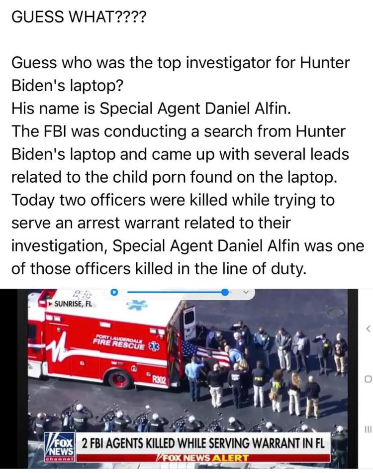 *I went ahead and added a screencap from something my dad sent me today; the radio in California is actually talking about the elites not only molesting children but also eating them, and even said it’s not outside the realm of possibility and that 37% of Americans believe it could be possible. I think it’s probably a higher percentage than that. Just an exciting tidbit I wanted to add in! I’m also adding this meme going around claiming one of the FBI agents who died in the shootout in Florida, which they said was involving “violent crimes against children,” is supposedly the person who was investigating the Hunter Biden Laptop. I haven’t been able to confirm this in any capacity, but I figured it could be something to look for.