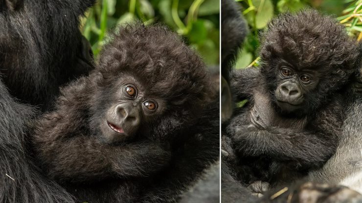 A tiny, three-week old baby was being held in the arms of a female gorilla. As the group Kirsty was traveling with stopped to watch, the baby popped its head up to see what was happening.
