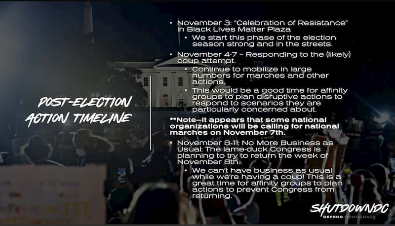 On the page, Shut Down DC sketches out its plans for election night and immediately following. On Nov. 4-7, the group says it plans to “do whatever it takes”: