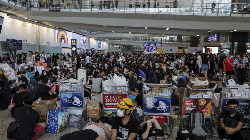 Rail operator MTR Corporation warned those checking in for flights at Hong Kong or Kowloon stations to get there two hours early to fight through the heavy foot traffic. As of noon local time, the Airport Authority said there were fewer take offs and landings as it worked to reschedule flights, per SCMP.