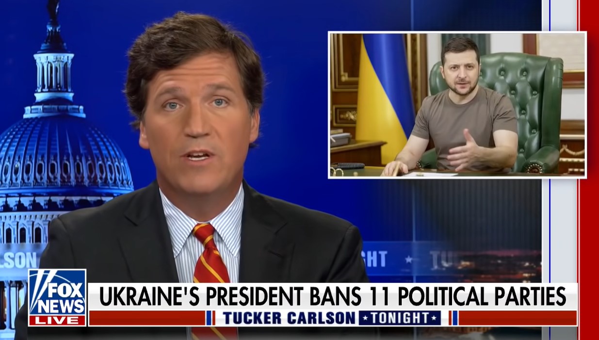 (Cara Castronuova) Tucker Carlson called out Ukrainian President Volodymyr Zelensky last night for literally banning opposition political parties in Ukraine. He also criticized Zelensky for seizing control of all his country’s media outlets, signing a decree that combines all Ukraine’s national TV channels into a single platform to stop “misinformation”.