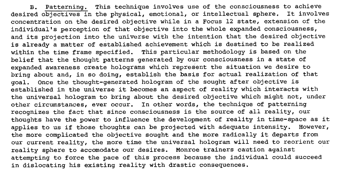 Remember that Monroe trainers warn the method of Patterning may have delay issues depending on how complicated the objective or how radically it departs from the current reality, but more importantly, forcing to accelerate this process could dislocate one’s reality with drastic consequences.