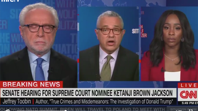 “This was really extraordinary. You have a judge here who has been on the bench for ten years almost. And we had the entire half-hour of Senator Hawley’s question about a single case where he got to recite the grisly details of, and say pedophilia over and over again,” Toobin complained after Wolf Blizter bemoaned “Senator Josh Hawley trying to paint Judge Jackson as somehow sympathetic to child porn offenders.”