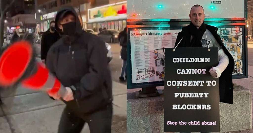 (Tom Pappert) Chris Elston, an activist raising awareness around the life changing decision to put children on puberty blocking drugs, was violently attacked by a gang of Antifa members wearing black bloc for holding a sign emblazoned with “Children cannot consent to puberty blockers – Stop The Child Abuse!”
