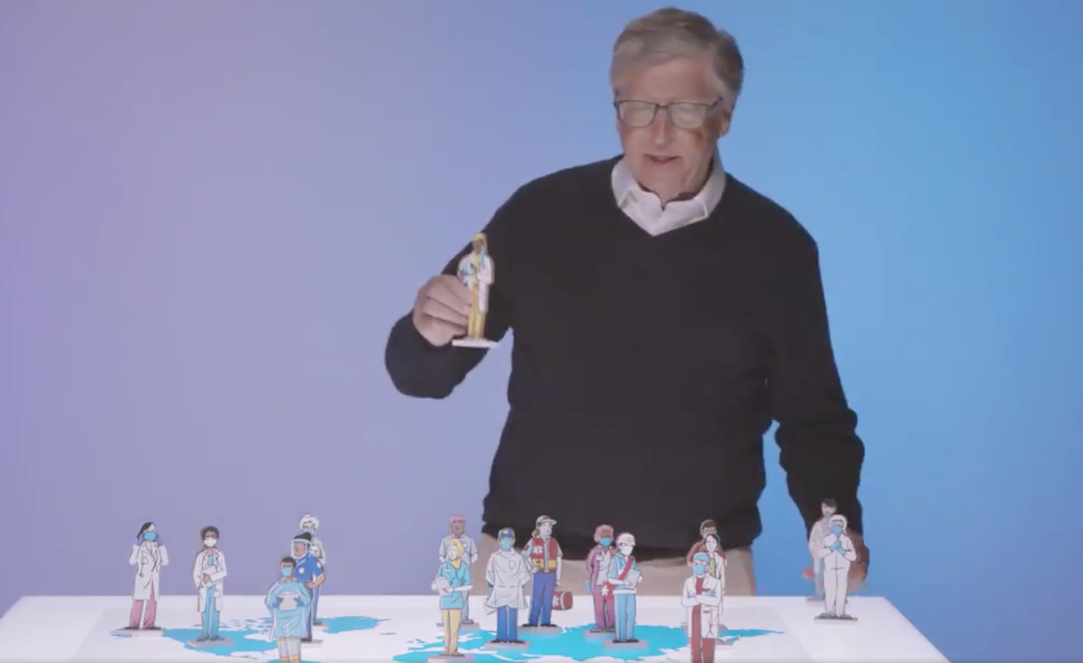 “When it comes to preventing pandemics, scientific tools alone aren’t enough.” Gates declares, as he moves around creepy looking toy figures on a map of the globe, like some kind of twisted puppet master.