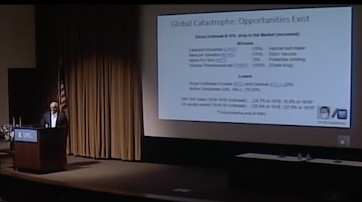During his 2018 speech “Imagining the Next Flu Pandemic – and Preventing it!” he presents a slide titled “Global Catastrophe: Opportunities Exist.” The slide outlines what type of stocks and industries surged during the Ebola outbreak, which he uses to extrapolate financial advice on how to “make money in the next pandemic.”