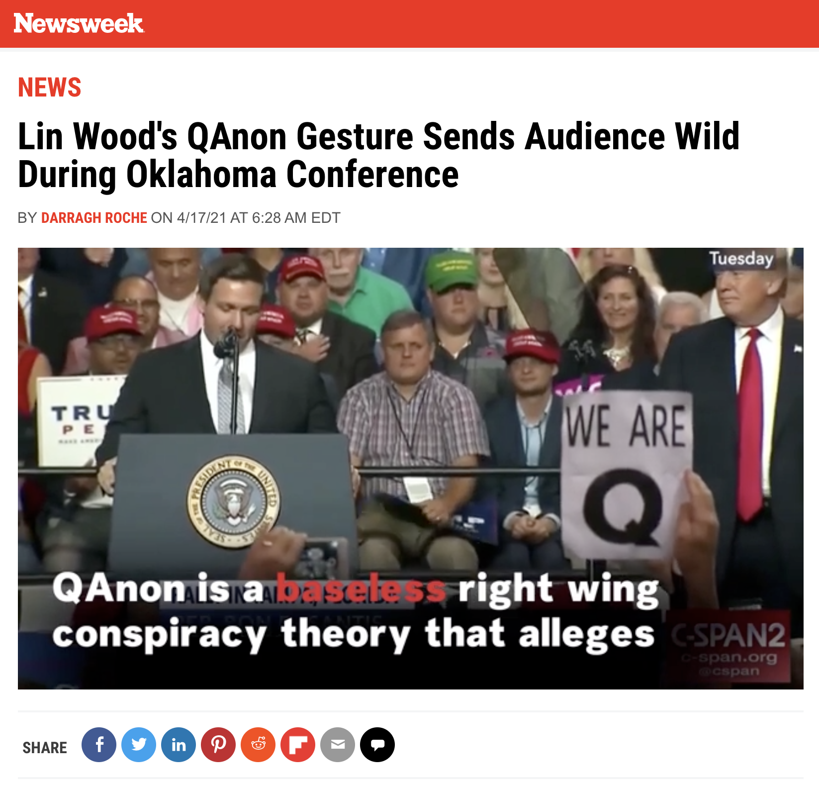 Newsweek immediately posted an article with a QAnon smear video at the top of their coverage of Wood’s speech.