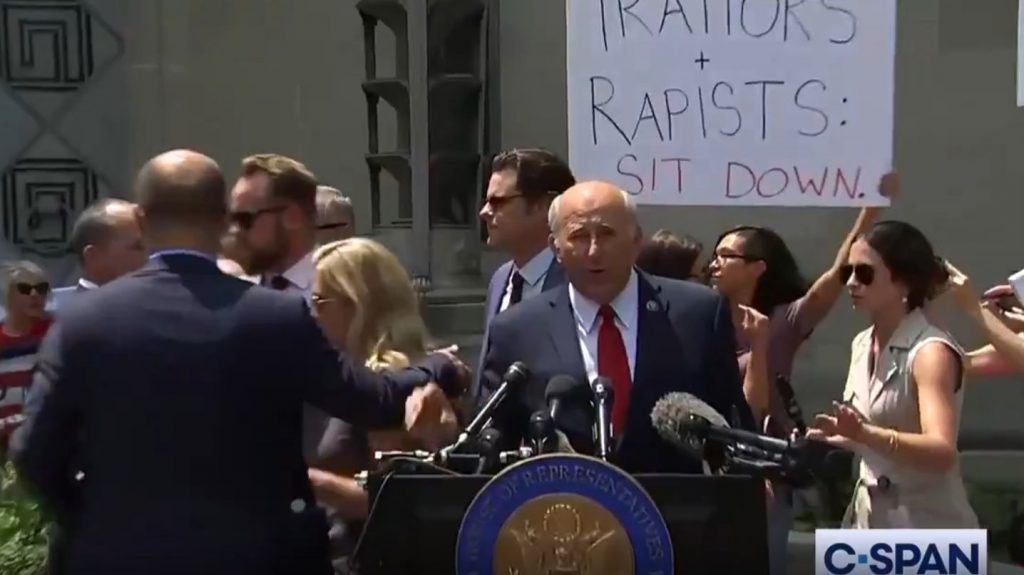 Counter-protesters subsequently crashed their press conference carrying signs such as “Traitors + Rapists: Sit Down” and “Pedophiles for Trump.” One of the counter-protesters even blew a whistle during the press conference.