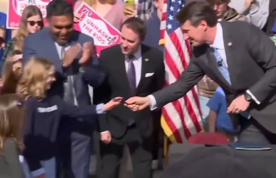 He hands the pen to a little girl who was suspended 9 times from school for not wearing a mask.