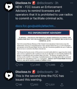 The FCC has also mentioned an Enforcement Advisory directed at amatuer and personal radio services licensees who may be planning to engage in criminal activity.