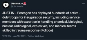 - 25,000 troops are now stationed in Washington DC (rumors place the number at 30,000), surrounding the Capitol with razor wire fences and essentially turned the Capitol into a militarized zone, complete with barricades and tactical positioning… for a virtual inauguration?