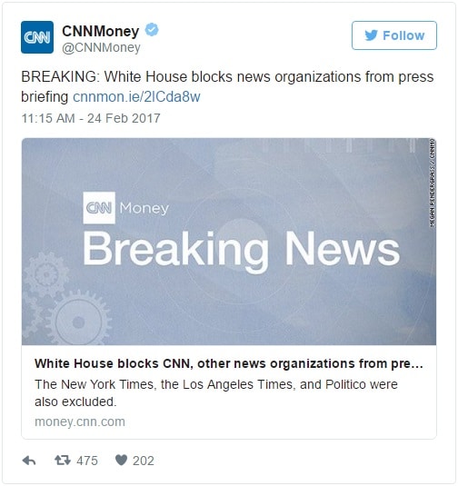 Just hours after President Donald Trump launched his latest rhetorical (and predictable) attack on the press during a speech to right-wing activists, CNN and other outlets have reportedly been blocked from attending Friday afternoon’s press briefing at the White House.