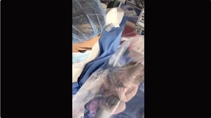 Heartbreaking video shows a mother and her newborn baby separated by a sheet of plastic as the mother tries to coo the infant during its first moments.